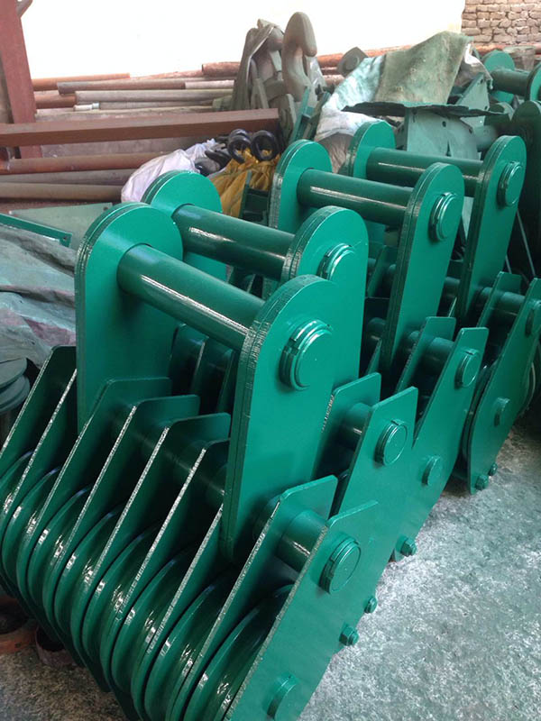 2、滑車按輪數的多少分為單門滑車、雙門滑車和多門滑車。按滑車與吊物的連接方式可分為吊鉤式滑車、鏈環式滑車、吊環式滑車和吊架式滑車四種。一般中小型的滑車多屬于吊鉤式、鏈環式和吊環式,而大型滑車采用吊環式和吊梁式。按輪和軸的接觸不同可分為輪軸間裝滑動軸承及滾動軸承兩種。按夾板是否可以打開來分,有開口滑車和閉口滑車。開口滑車的夾板是可以打開的,便于裝繩索,一般的都是單門滑車,它常用于扒桿底腳處作導向滑車用。滑車按使用的方式不同又分為定滑車和動滑車。
